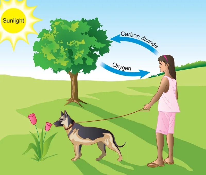 Let’s get back to natural systems. I gave you an example of the human body being a natural system. Another natural system that you’re probably familiar with is the oxygen-carbon dioxide cycle. Humans and other animals have this relationship with plants. We breathe in oxygen. We breathe out carbon dioxide, CO2. Carbon dioxide is a waste product for us. We take in what we need from the oxygen, then we give out the waste, which is carbon dioxide for us, but plants breathe in the carbon dioxide and that’s food for them. They use carbon dioxide for photosynthesis to make their food and they give off their own waste product. The waste or by-product of that process is oxygen which is something that gives us life. Do you see the circle in that relationship? Is there any special training that’s needed for us to have that relationship with plants and for them to have that relationship with us? Do either of us, plants or humans, have any more value than the other? Does anyone have more power than the other in that relationship? Nope. It’s A leads to B leads to C leads back to A, leads back to B, C back to A over and over and over again. It’s a symbiotic, give-and-take relationship. Nature is full of these symbiotic, give-and-take relationships.